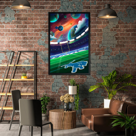 Celebrate your home team pride with this original space themed artwork! Featuring a surreal galaxy and field design with your favorite team’s logos. A truly unique piece that is out of this world! Framed and ready to hang print that takes your fan cave to another planet.