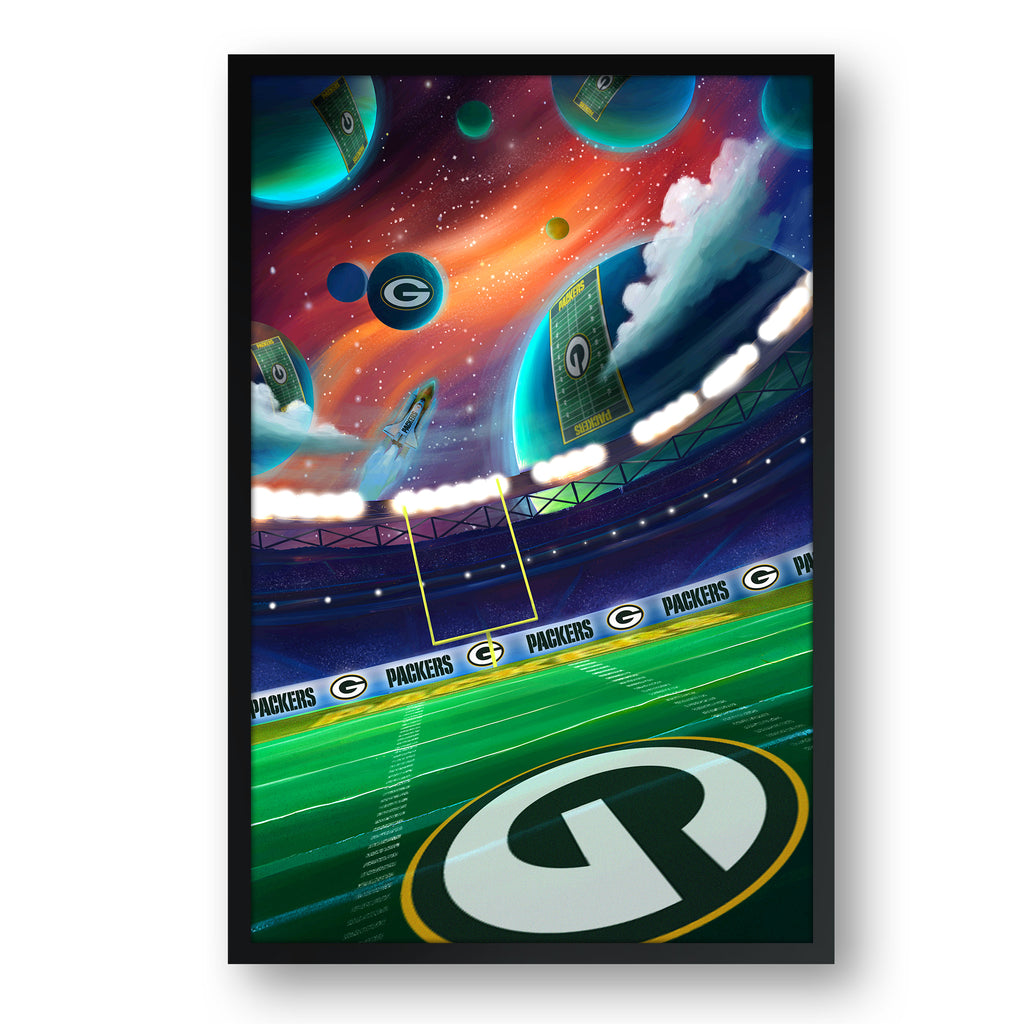 Celebrate your home team pride with this original space themed artwork! Featuring a surreal galaxy and field design with your favorite team’s logos. A truly unique piece that is out of this world! Framed and ready to hang print that takes your fan cave to another planet.