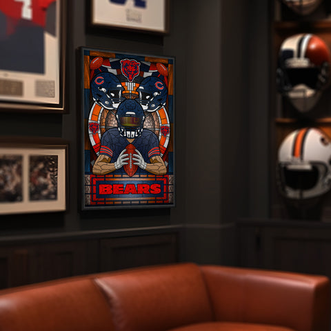 The Team Pride Stained Glass Art Print fuses the timeless aesthetic of stained glass with the passion of the gridiron. Featuring a bold color print that mimics the craftmanship of stained glass, it’s printed on high-quality paper and finished with a black wood frame. Ready to hang, this artwork is the perfect blend of sports devotion and artistic flair. This is not actual stained glass.