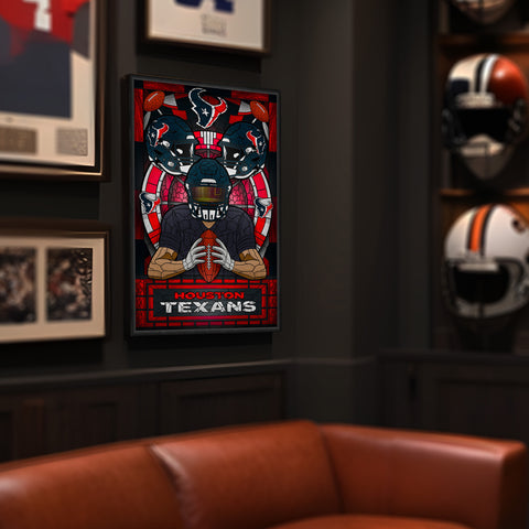 The Team Pride Stained Glass Art Print fuses the timeless aesthetic of stained glass with the passion of the gridiron. Featuring a bold color print that mimics the craftmanship of stained glass, it’s printed on high-quality paper and finished with a black wood frame. Ready to hang, this artwork is the perfect blend of sports devotion and artistic flair. This is not actual stained glass.