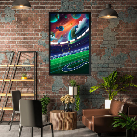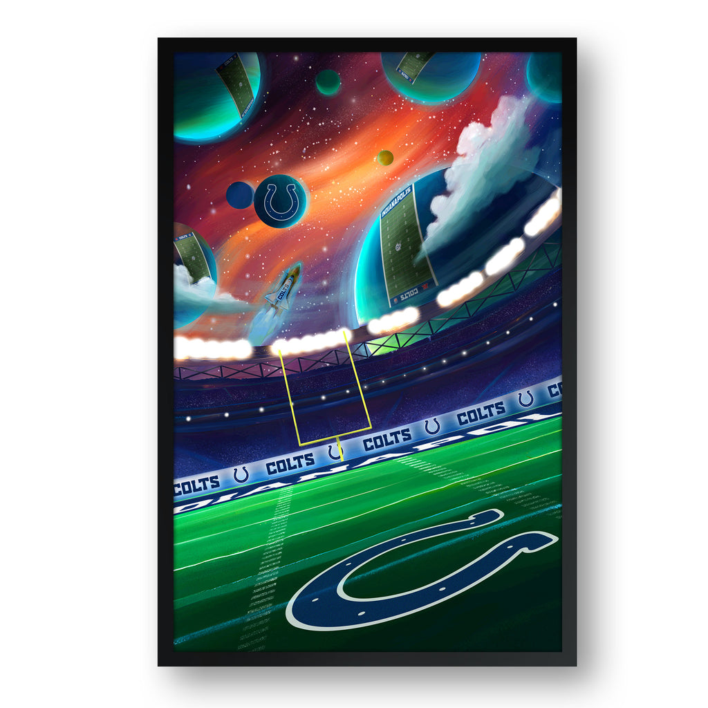 Celebrate your home team pride with this original space themed artwork! Featuring a surreal galaxy and field design with your favorite team’s logos. A truly unique piece that is out of this world! Framed and ready to hang print that takes your fan cave to another planet.