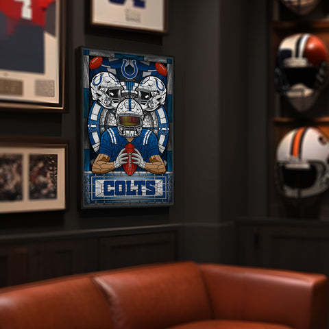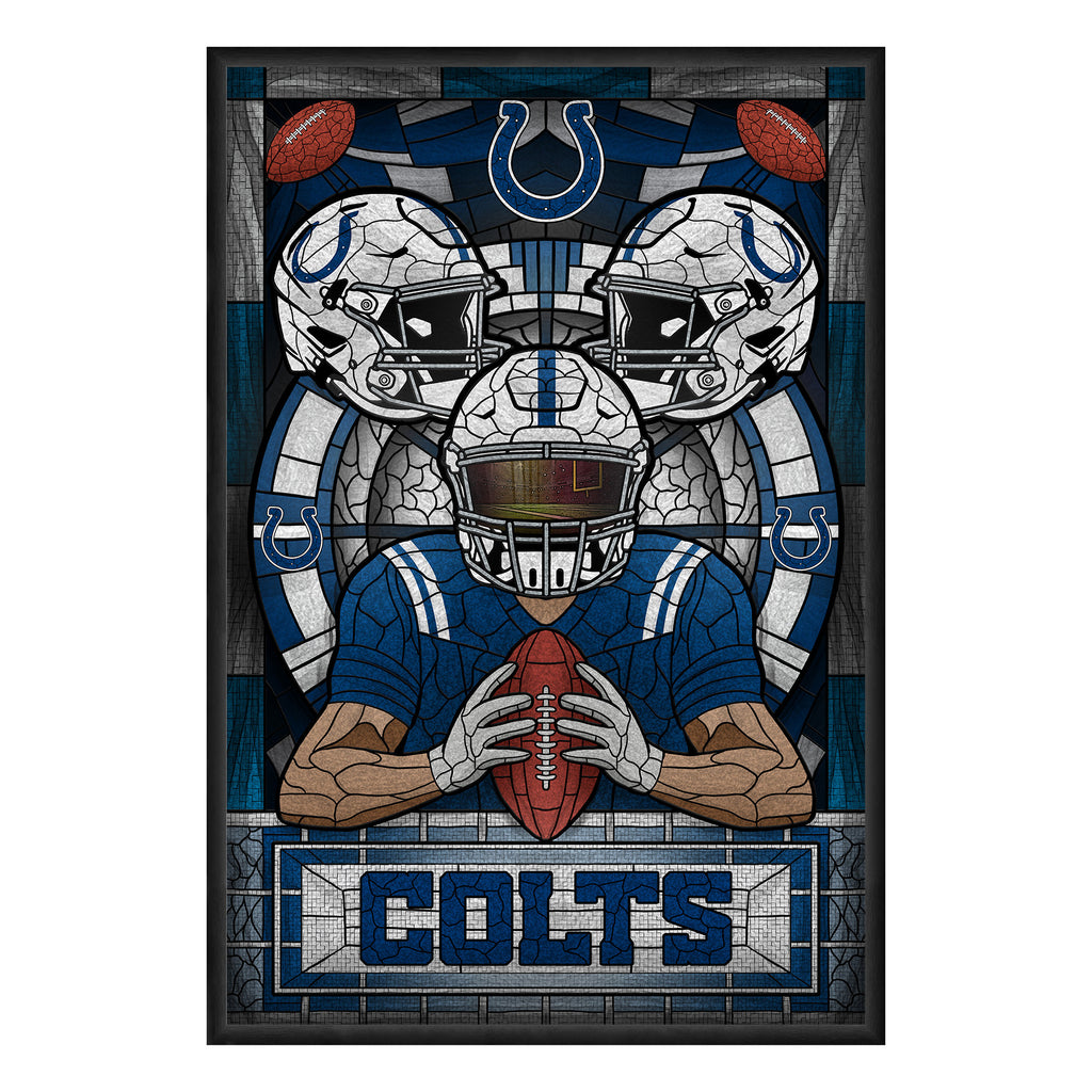 The Team Pride Stained Glass Art Print fuses the timeless aesthetic of stained glass with the passion of the gridiron. Featuring a bold color print that mimics the craftmanship of stained glass, it’s printed on high-quality paper and finished with a black wood frame. Ready to hang, this artwork is the perfect blend of sports devotion and artistic flair. This is not actual stained glass.