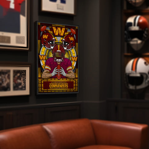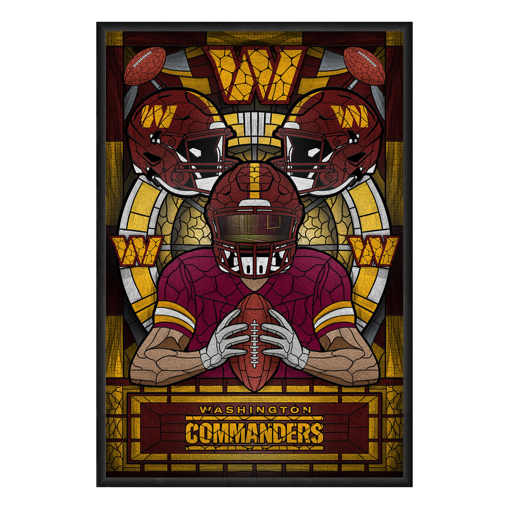 The Team Pride Stained Glass Art Print fuses the timeless aesthetic of stained glass with the passion of the gridiron. Featuring a bold color print that mimics the craftmanship of stained glass, it’s printed on high-quality paper and finished with a black wood frame. Ready to hang, this artwork is the perfect blend of sports devotion and artistic flair. This is not actual stained glass.